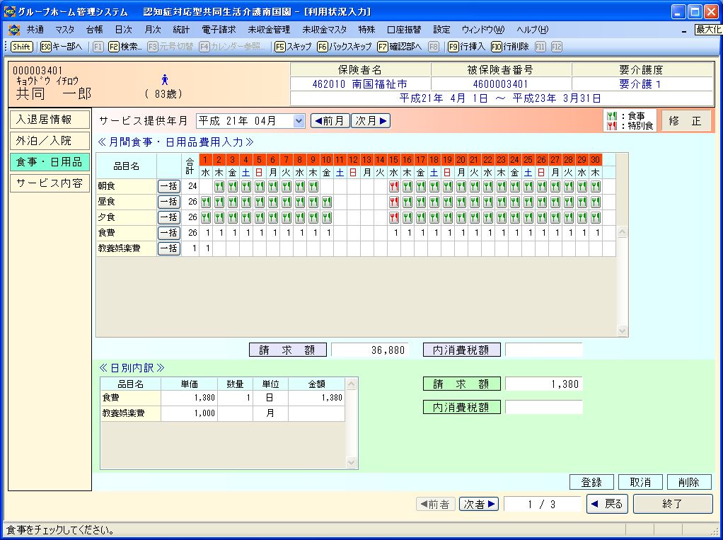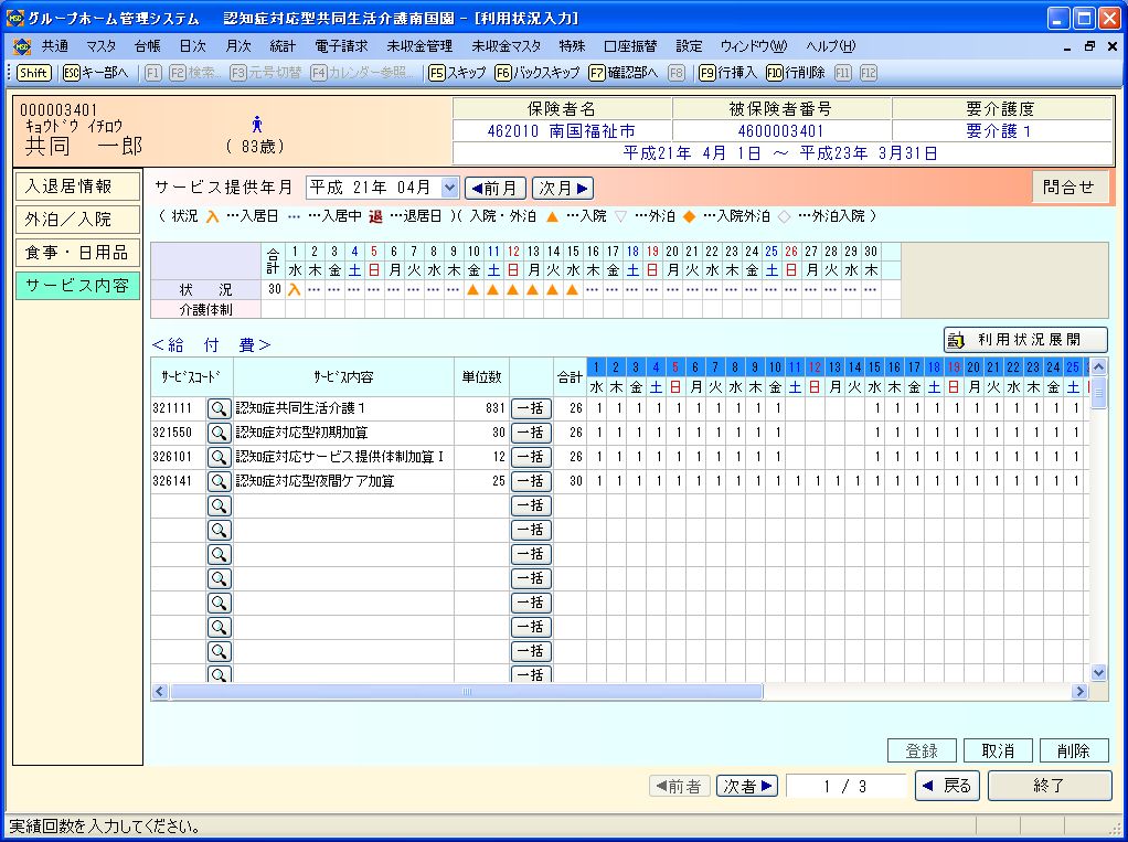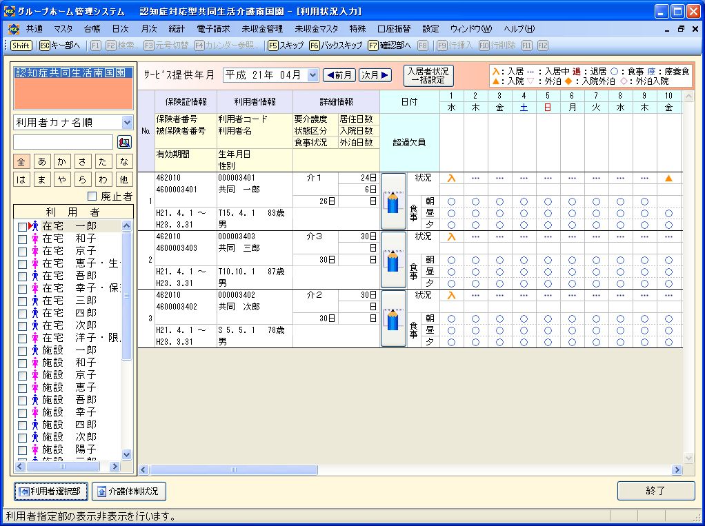 入所者の状況を一目で把握、状況入力画面から請求に必要な情報を入力