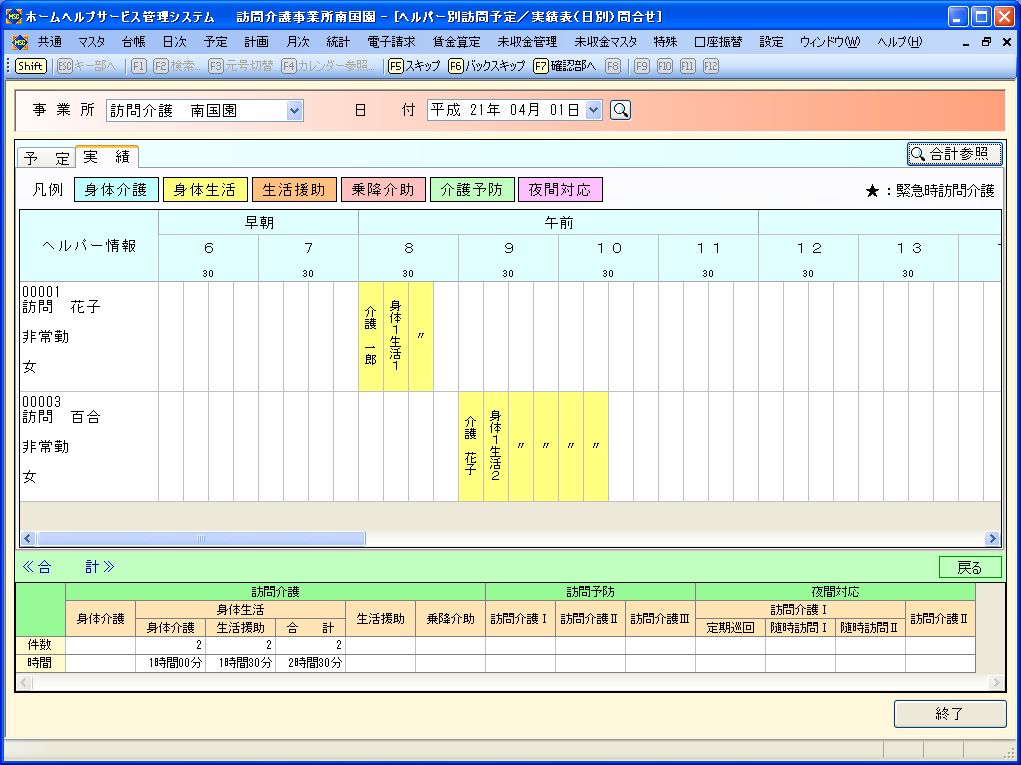 作成された日々の予定は、ヘルパーごとの訪問先、利用者ごとの訪問ヘルパーをタイムチャートで照会することができるので、途中での派遣計画の見直し等有効に活用できます。