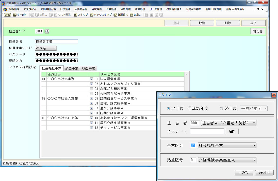 会計システム起動時に操作する職員の選択とパスワードの入力を行います。担当者ごとに設定された事業所及び拠点区分のみを選択することができます。