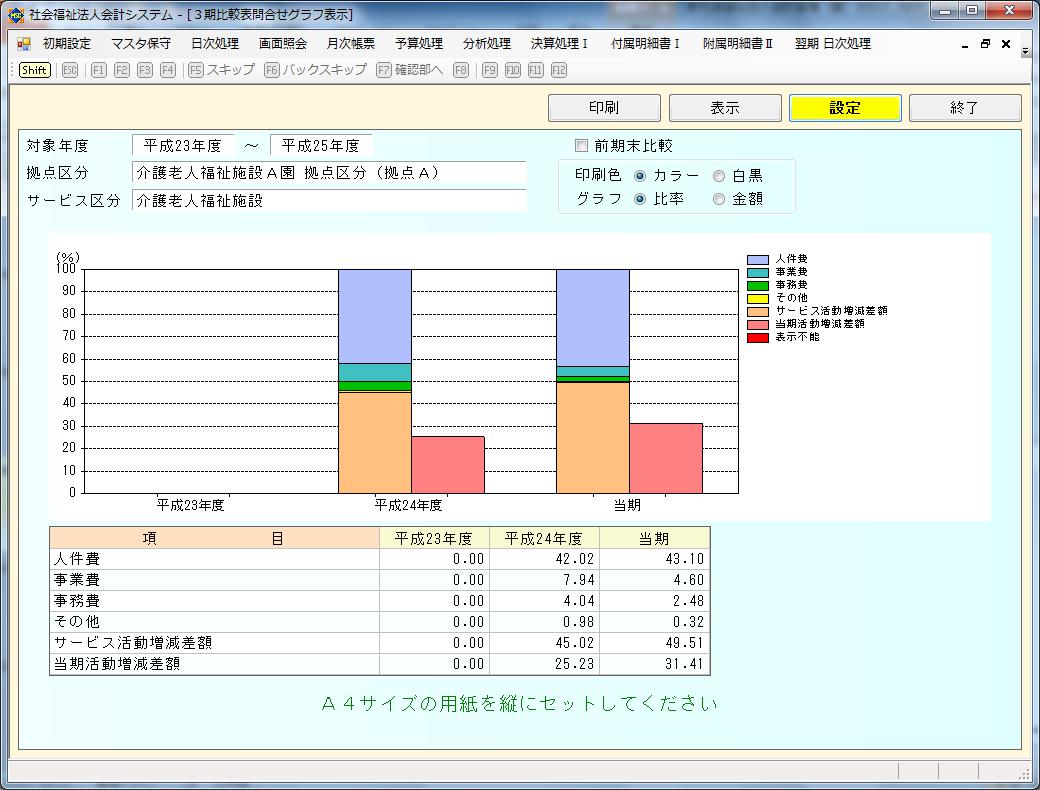 活動収支及び資金収支増減差額分析表から3期比較表、5期推移表、比率分析表・比率分析内訳表などの分析資料を画面で照会ならびに出力することができます。