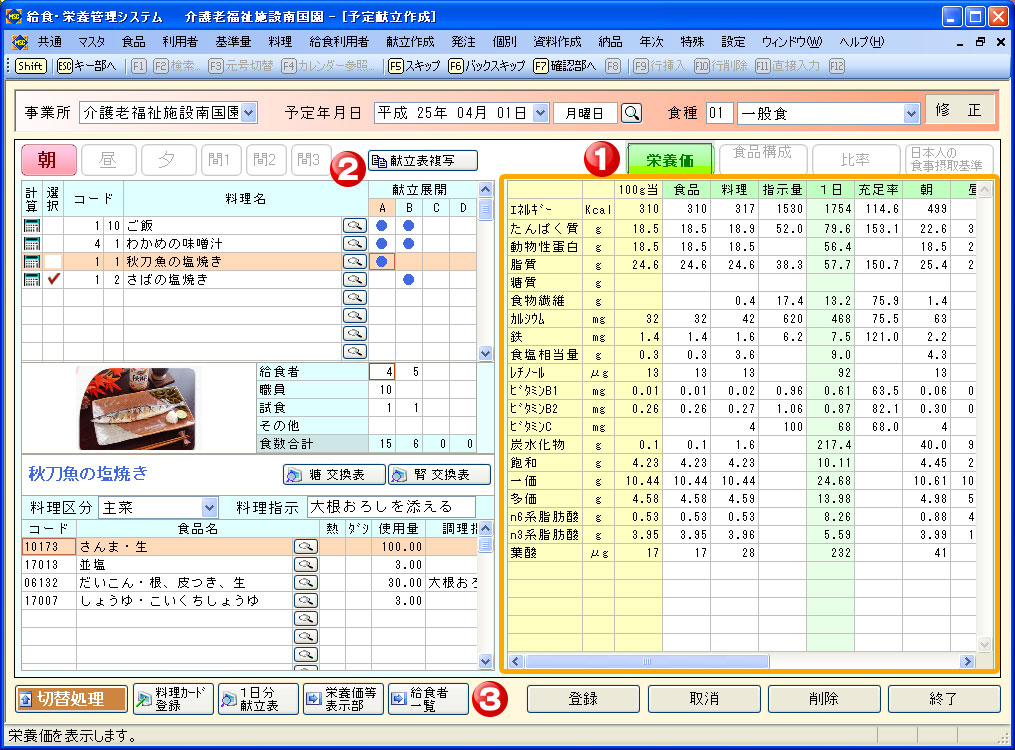 月間食数、予定献立、実施献立から献立表等、献立に関する処理をします。