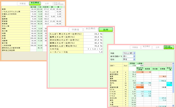 基準量に対する栄養価の充足率のほか、食品群ごとの食品構成の充足率、たんぱく質エネルギー比率及び日本人の食事摂取基準に対する充足をシミュレーションすることができます。