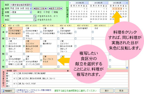 献立作成日以前に作成された献立を組み合わせしながら簡単に献立を作成することができます。抽出条件を利用して、同一料理または同一食品を使用した実施料理が抽出できるので献立の重複チェックをすることができます。