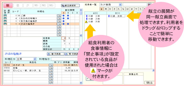 • 1画面で複数の献立種類を展開しながら献立作成が行えます。