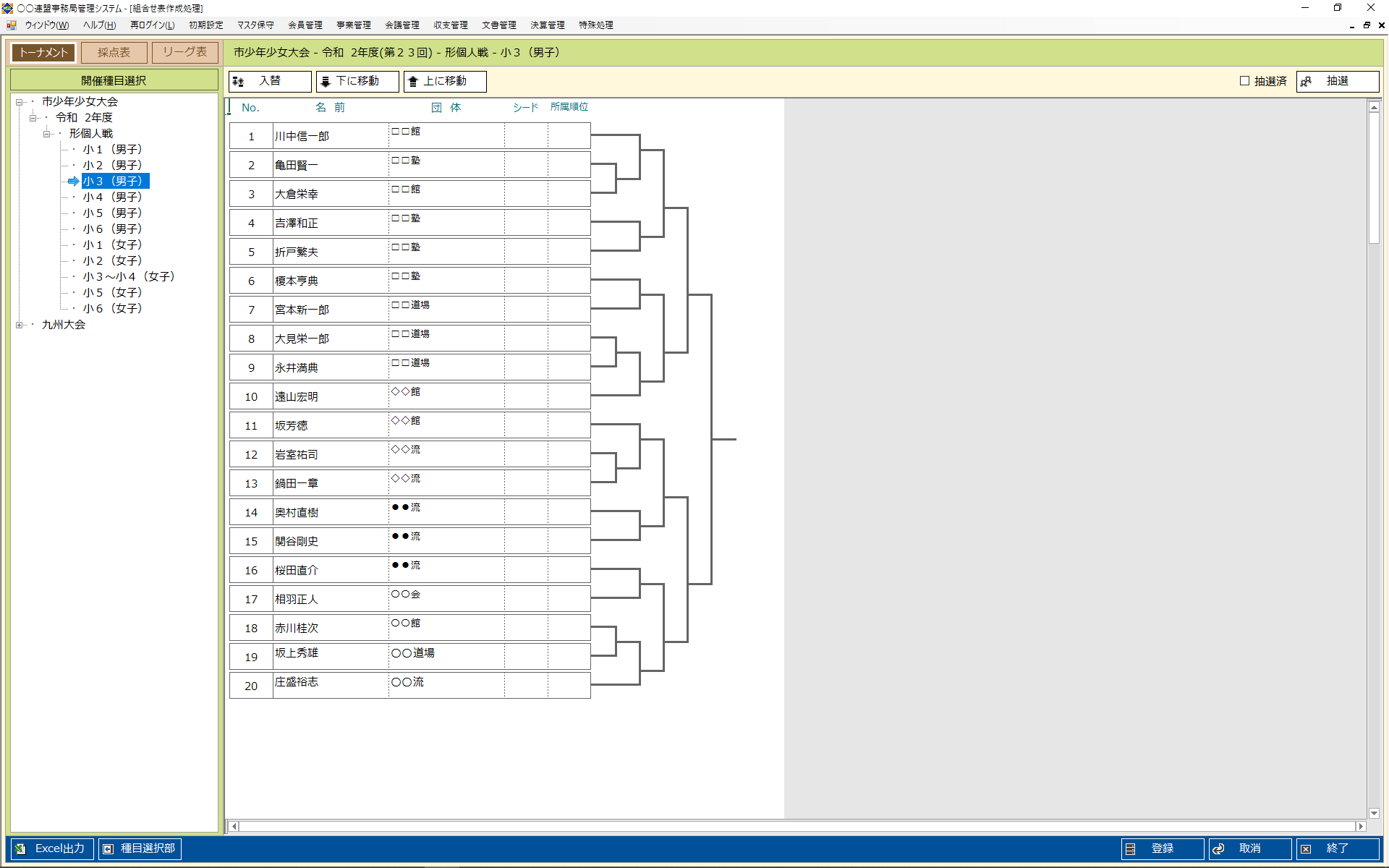- 所属団体の内訳別(幼児、小学、中学、高校、大学、一般、理事、顧問、相談役等)登録者数を一覧で出力します。