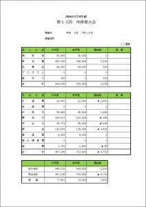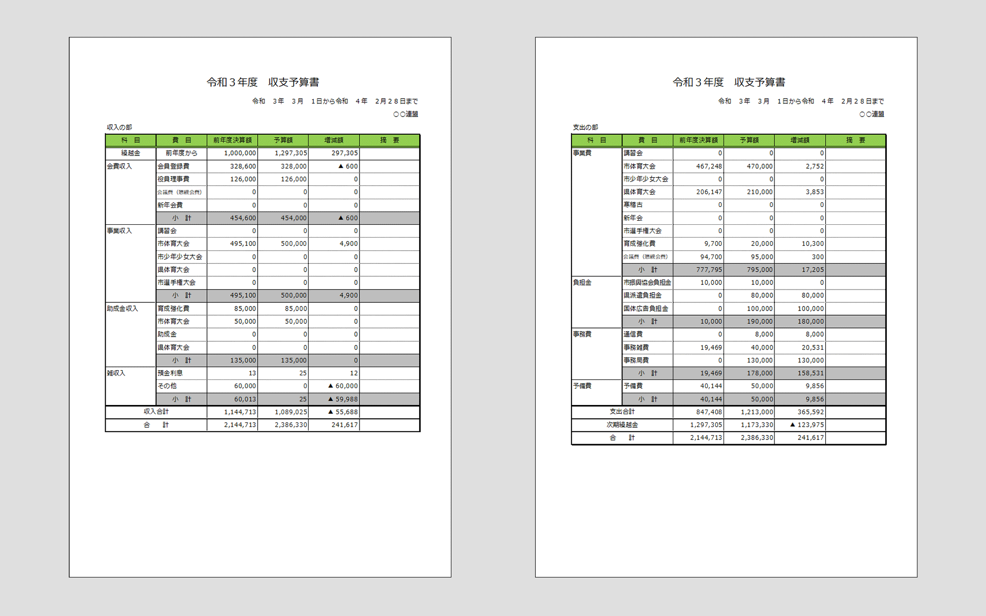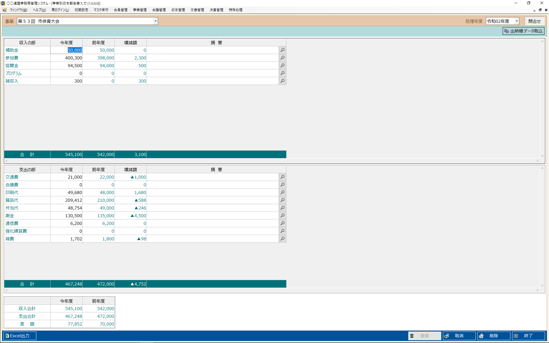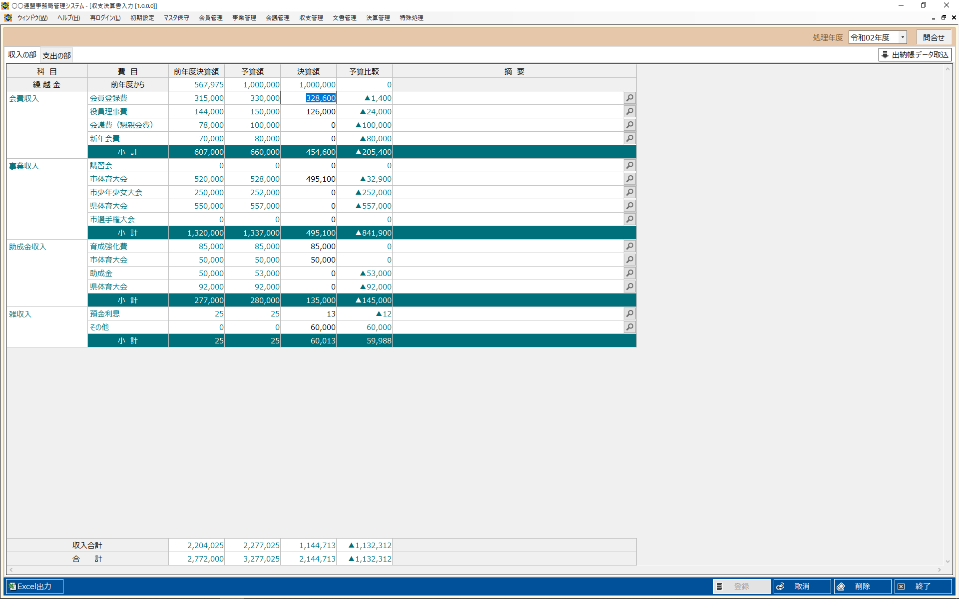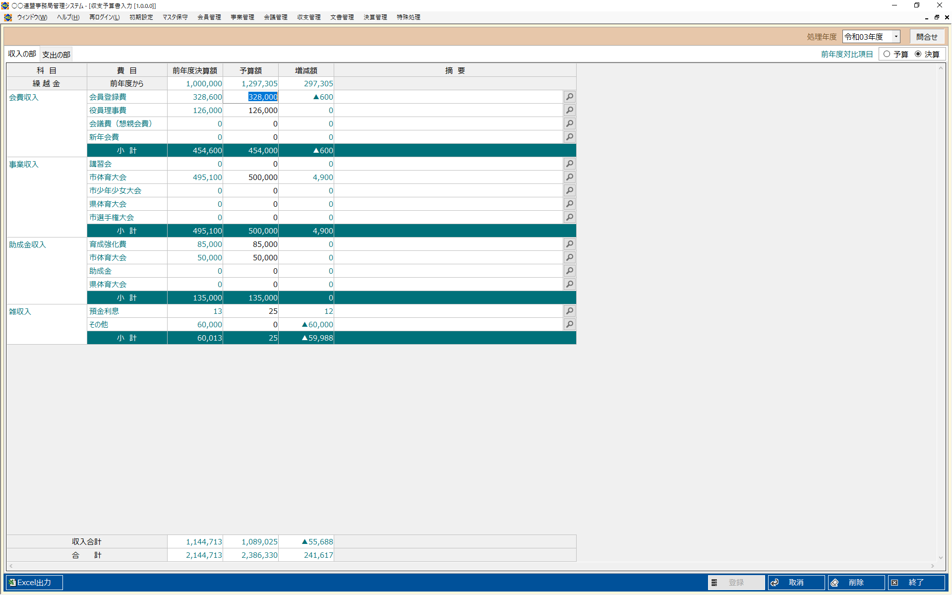 - 収支予算書の作成を行います。前年度の予算又は決算額を参照しながら各予算額の設定を行うことができます。EXCELにて出力されますので総会資料として編集を自由に行うことが出来ます。