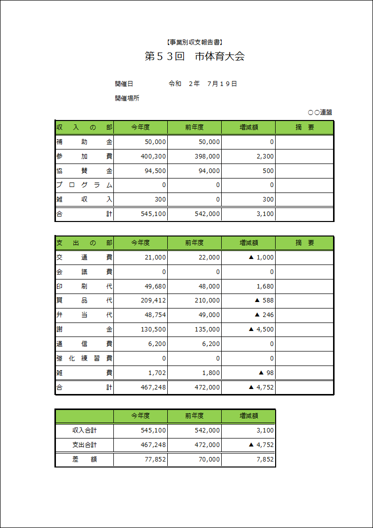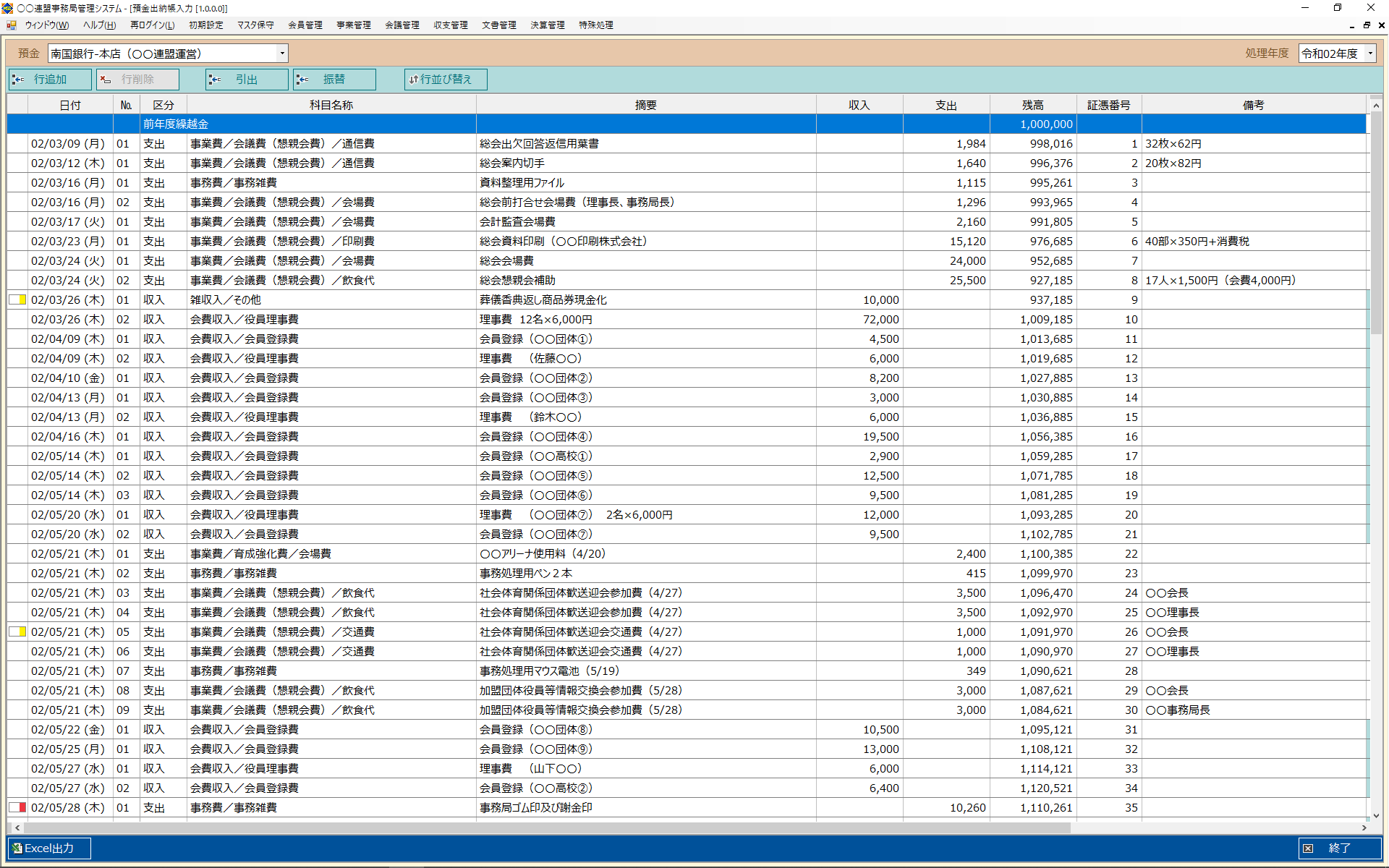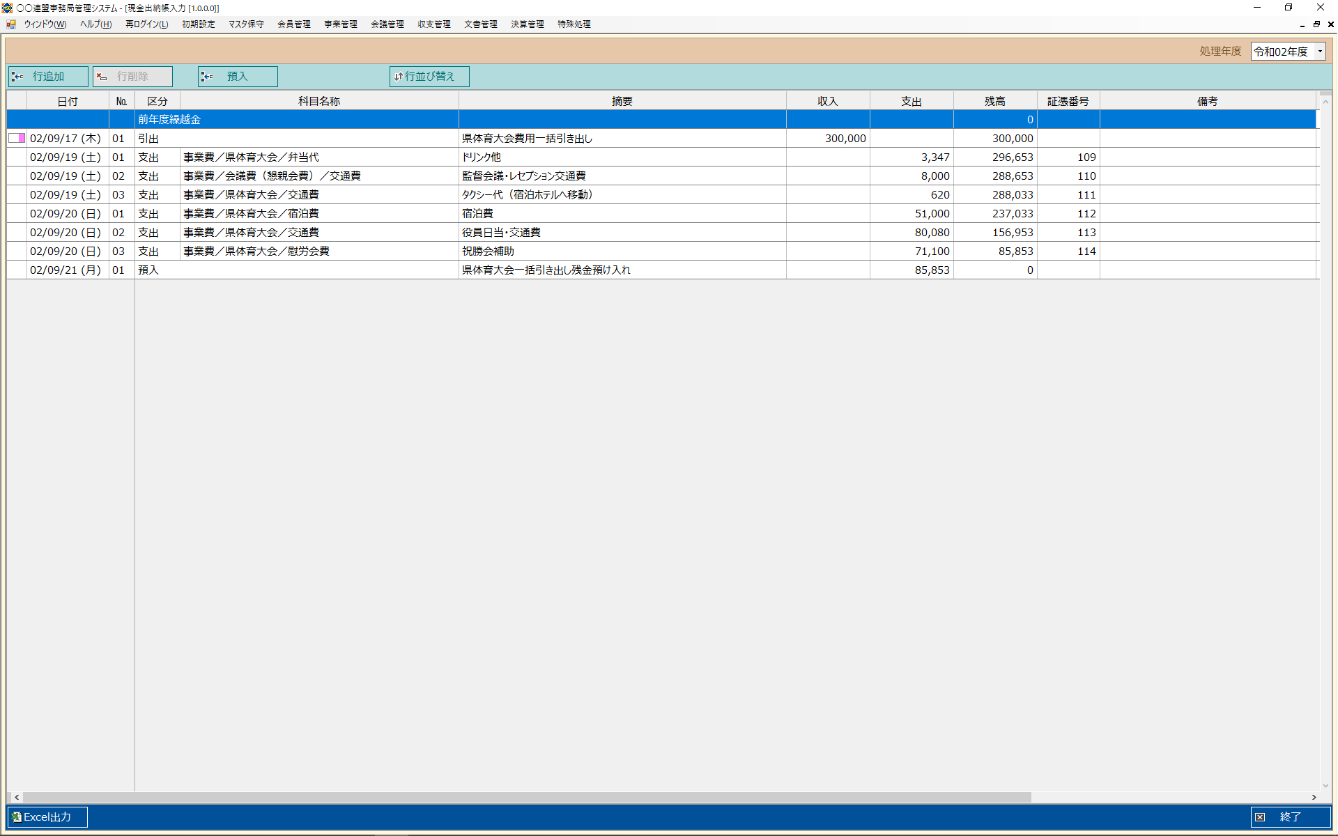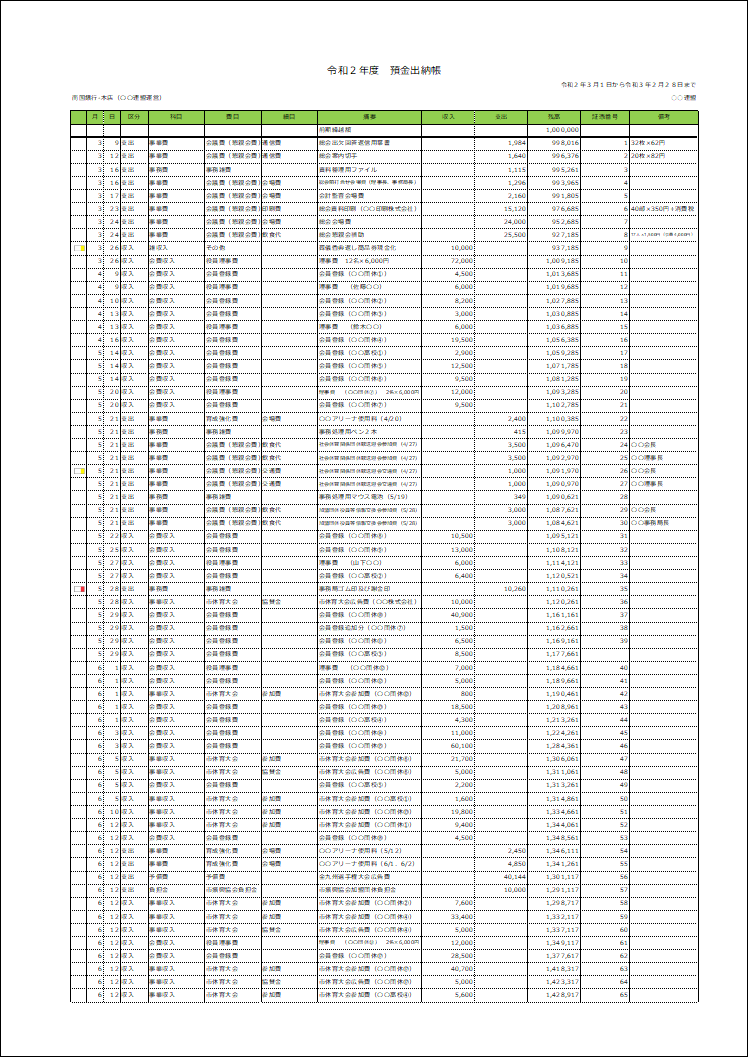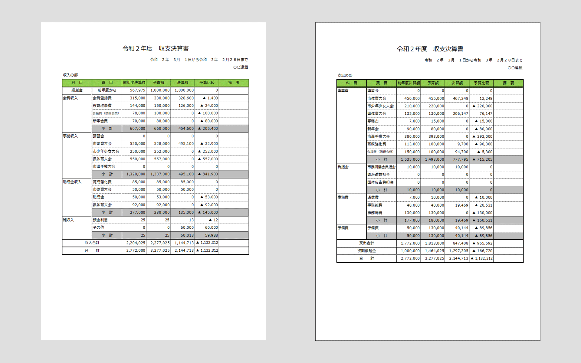 - 収支決算書の作成を行います。(出納帳データの取り込みによりすべての金額が展開されます。)EXCELにて出力されますので総会資料として編集を自由に行うことが出来ます。