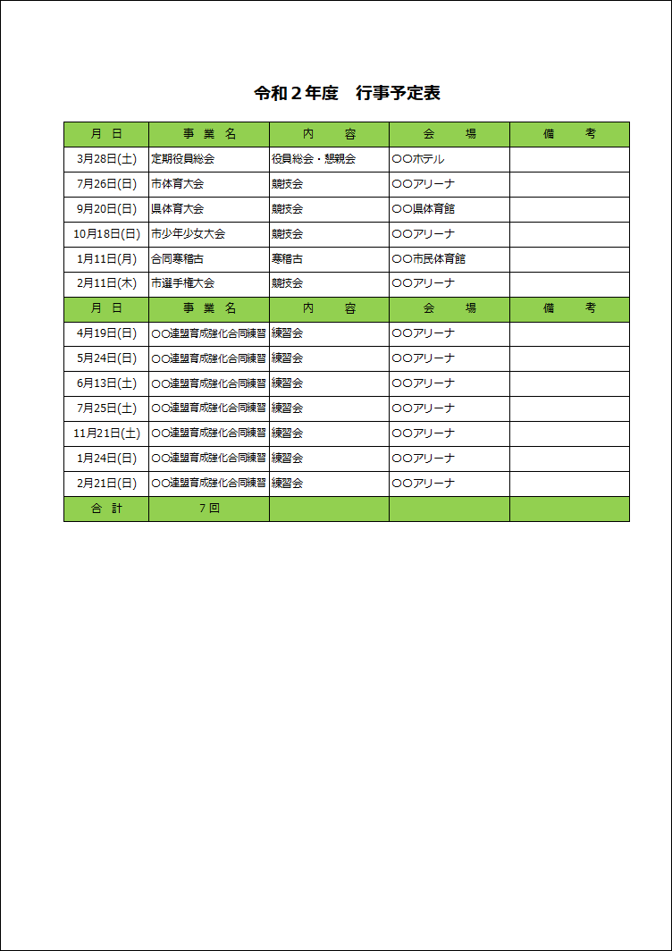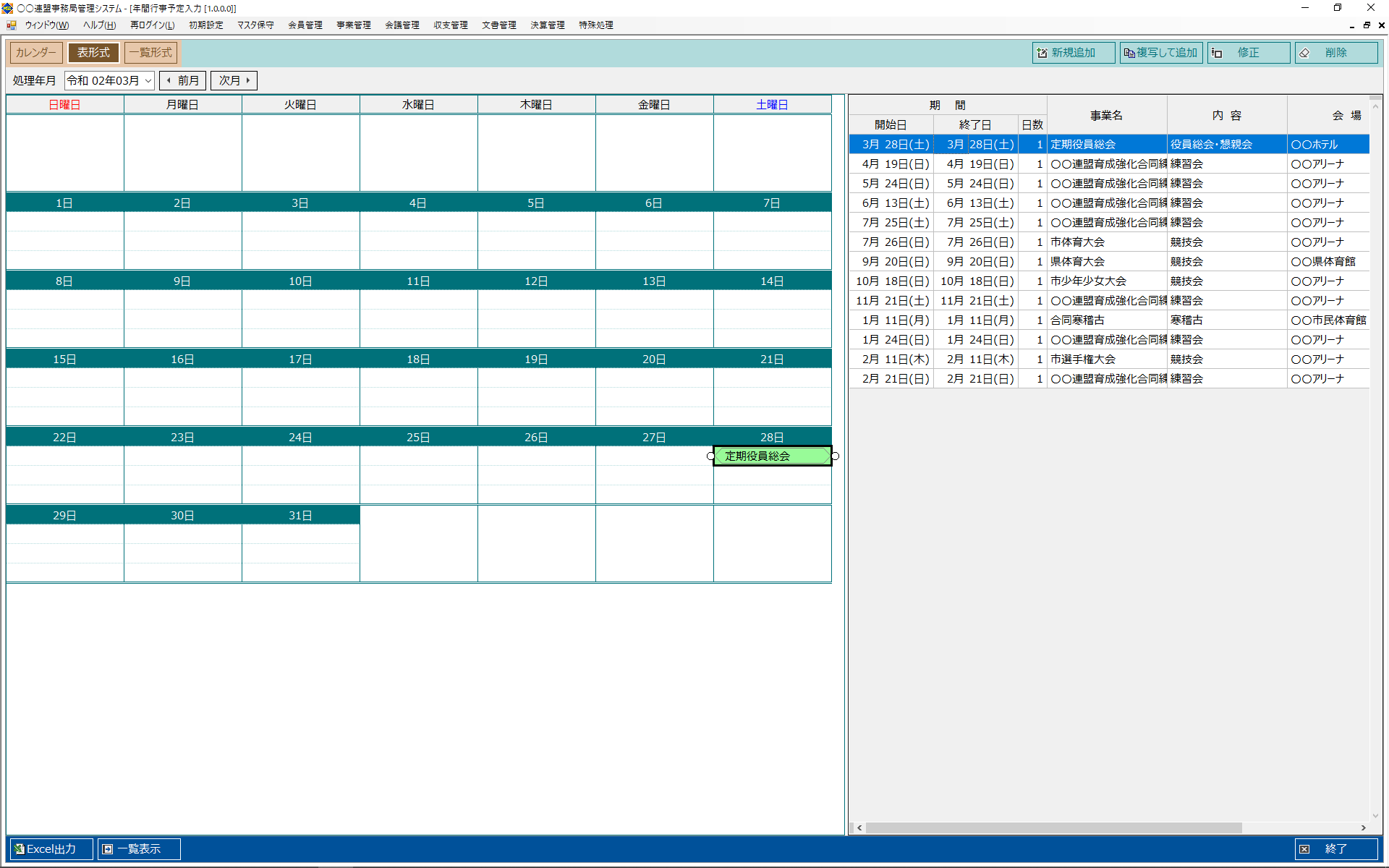 - 年間行事予定の作成を行います。前年度の予定を参照しながら年間から月間(表・一覧)での登録画面切り替えにより行事の登録を行います。 EXCELにて出力されますので総会資料として編集を自由に行うことが出来ます。(前年度年間行事の実施報告についても、前年度年間行事予算を出力し編集することで容易に作成することが可能です。 )