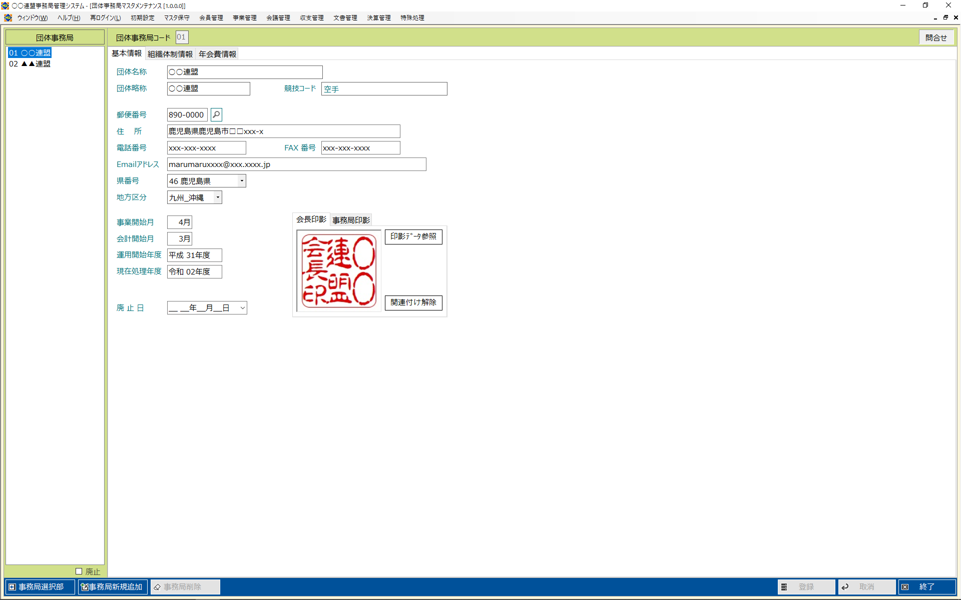 - 基本情報・・・団体の基本情報を登録します。(団体名称、事務局住所、会長印影、事務局印影、事業開始月、会計開始月、その他)