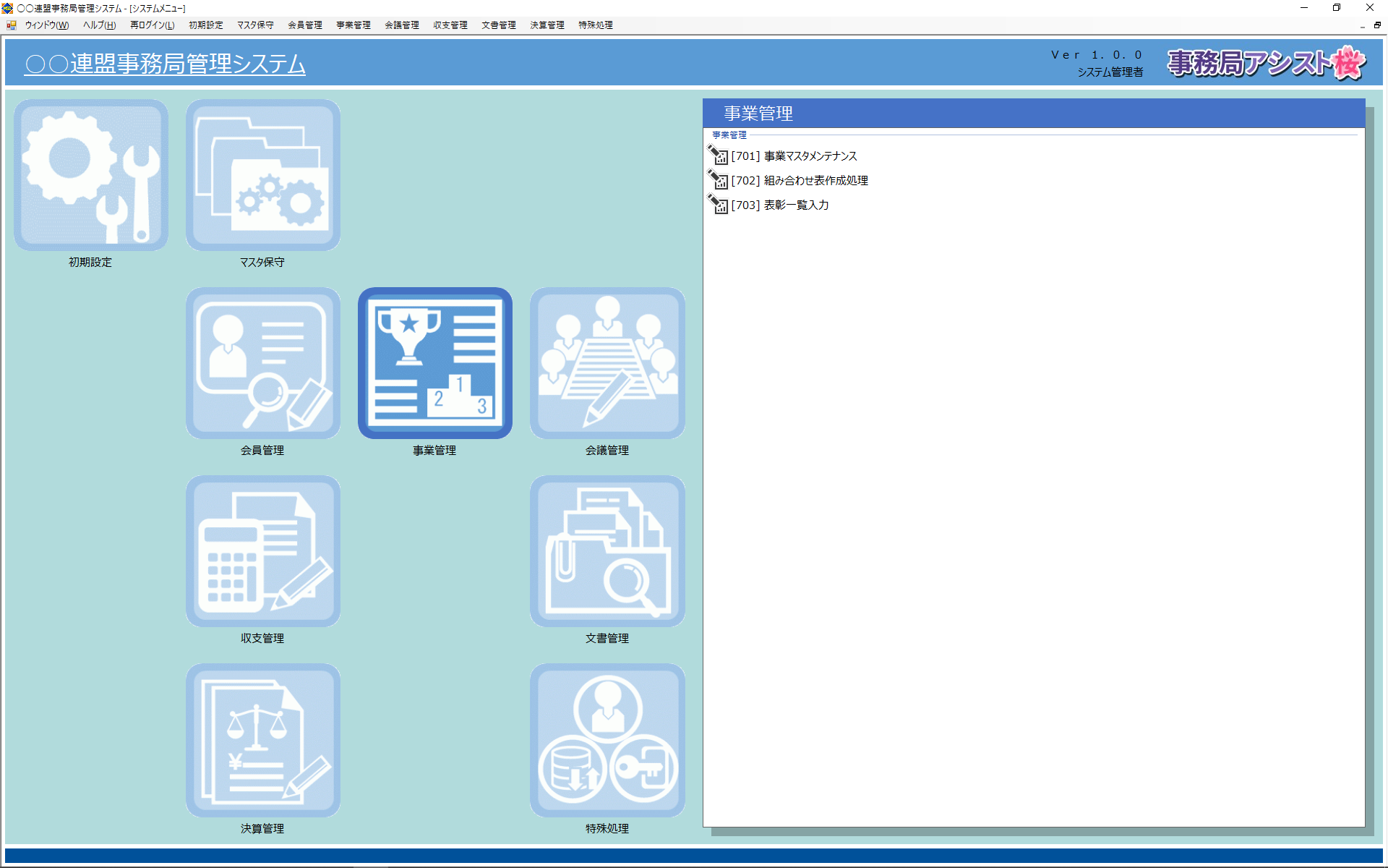 事務局作業に必要な基本、役員及び会員費単価等の情報設定を行います。