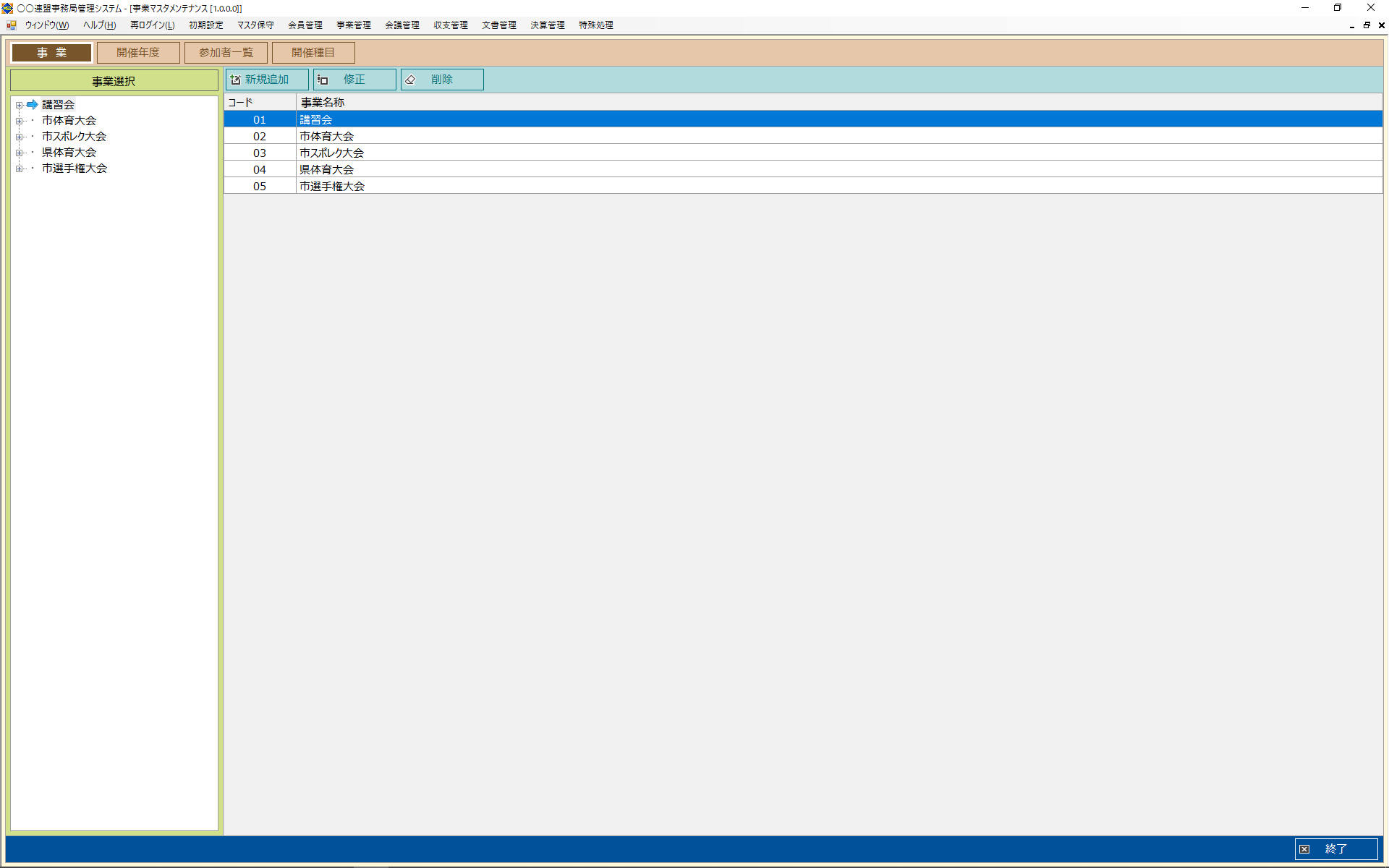 - 事業の登録を行います。(大会の場合は申込情報及び種目・入賞者数の設定までを登録します。)