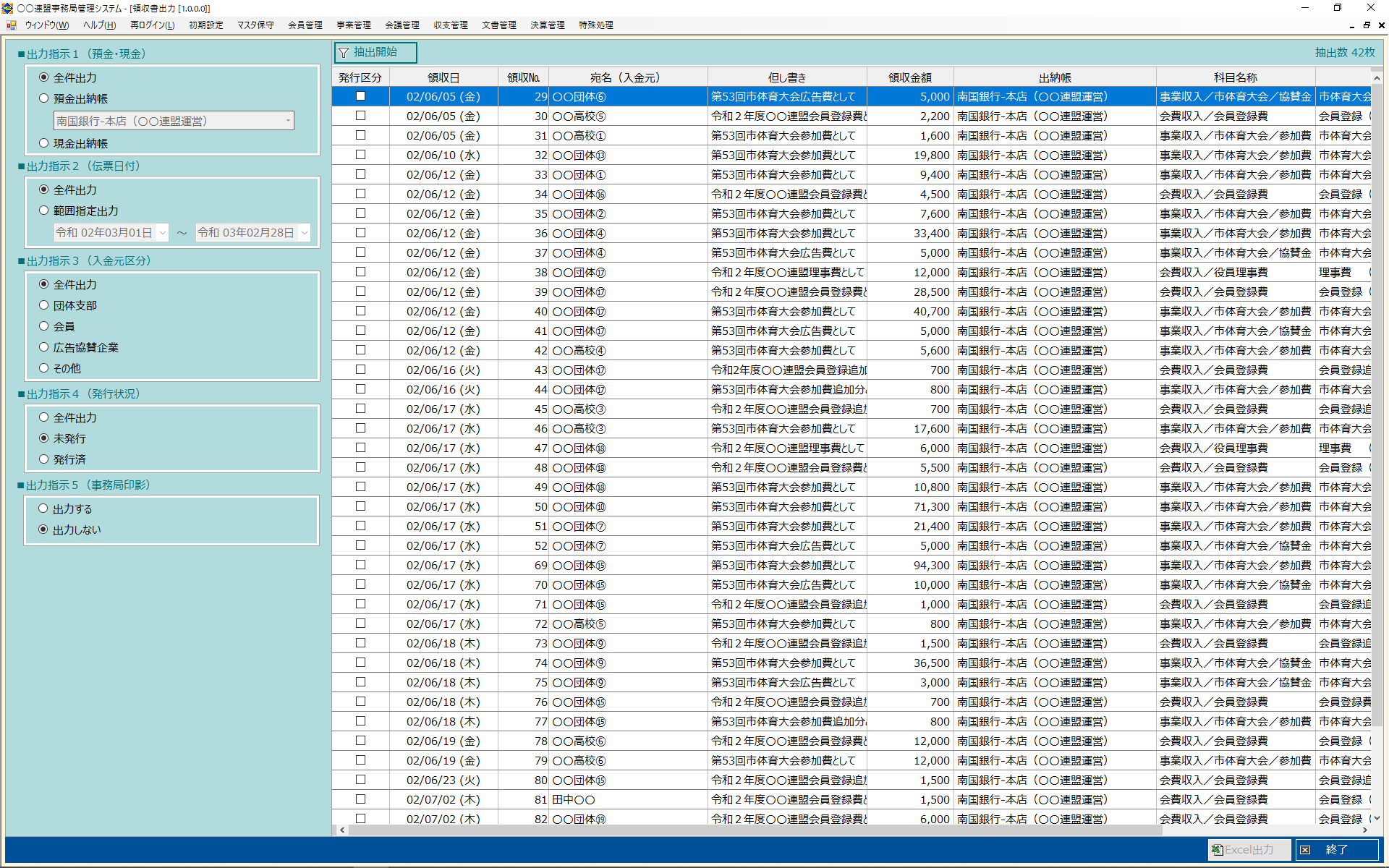 入出金の管理(預金出納帳、現金出納帳)を行います。また、会費や大会参加費等の領収書を出力することができ事業別収支報告書や決算報告書を自動で作成するための情報ともなります。
